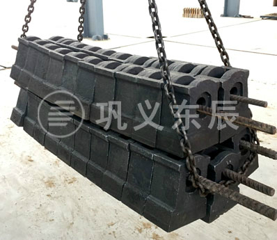 巩义东辰生产的可逆锤破锤头的锤头部位采用高铬合金材料,锤柄部位采用韧性较好的低合金钢材料,利用热复合将两种不同性能和功效的材料在液液状态下使其熔融为一体,解决了镶合金和两次复合浇铸锤头容易出现的断裂、掉块、掉头等现象,提高了锤头使用的安全性。